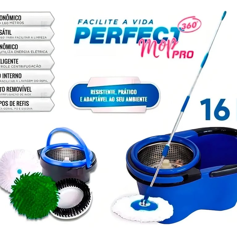 – Limpeza fácil e rápida! Com o Mop Perfect Pro 16L, sua faxina se torna leve e eficiente. Ideal para quem quer conforto e durabilidade, ele é super prático e facilita o dia a dia. Destaques: Balde resistente com capacidade de 16L (8L úteis) Giro 360° com cesto inox removível para centrifugação prática Cabo ergonômico de inox, ajustável até 1,60 m e com inclinação de 180° 3 refis para diferentes tipos de sujeira: Microfibra para limpeza geral Microfibra atrai-pó Escovão para sujeira pesada Mãos limpas! Sem contato com a sujeira. Ideal para qualquer piso, incluindo porcelanato e laminado! Perguntas Frequentes: Preciso varrer antes? Não! O refil atrai pó cuida disso para você. Posso usar água sanitária? Sim, o mop resiste a produtos fortes. Basta enxaguar depois. Risco de arranhar o piso? Não! Os refis não soltam fiapos e não riscam. Como escolher o mop certo? Busque ergonomia e durabilidade. O Perfect Pro oferece tudo isso! Especificações Técnicas: Capacidade total: 16L (8L úteis) Dimensões do balde: 47 x 29,5 x 26,5 cm Altura do cabo: até 1,60 m Peso: 2,6 kg Cor: Azul e Preto Conteúdo da embalagem: 1 balde + 1 cabo inox ajustável + 3 refis Invista na eficiência de sua limpeza! Adquira já o Mop Perfect Pro 16L e transforme sua faxina em uma tarefa leve e rápida, com resultados profissionais. Garantia do vendedor: 3 meses
